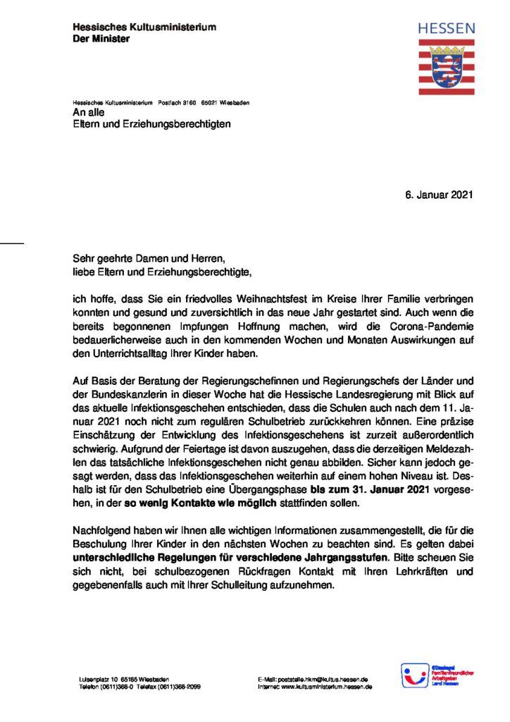 Das hessische Kultusministerium hat am 06.01.2021 einen weiteren Elternbrief diesbezüglich veröffentlicht, welchen wir hier für Sie bereitstellen: