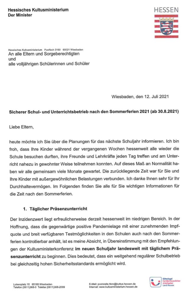 Die aktuelle Planung, wie es nach den Sommerferien an den hessischen Schulen weiter geht, hat das Hessische Kultusministerium im nachfolgenden Schreiben vom 12.07.2021 bekannt gegeben: